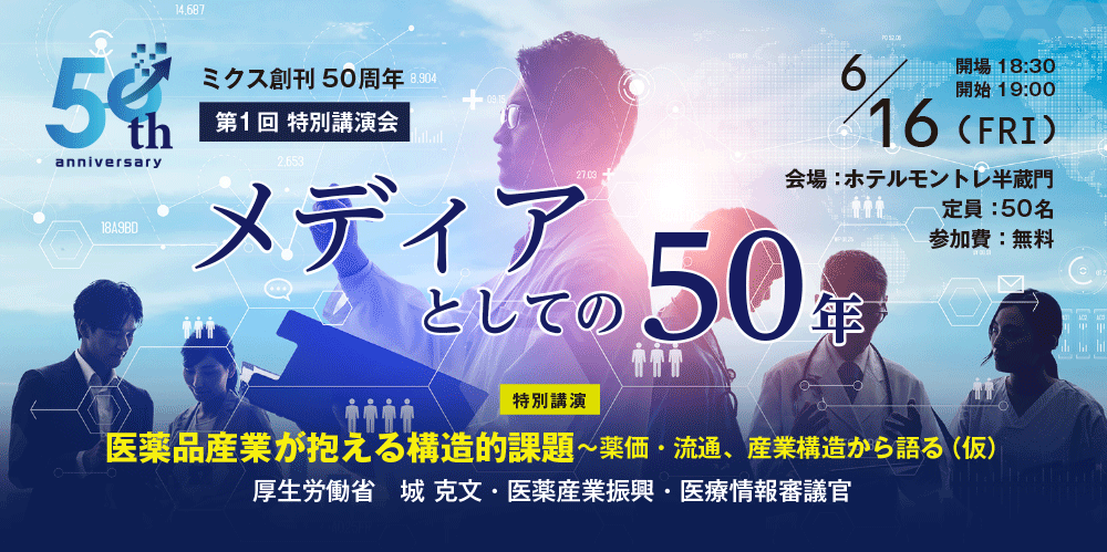 1973年の月刊ディテールマンの発刊以降、月刊ミクス、Monthlyミクスと雑誌タイトルを変えながら50年間にわたり、製薬産業が直面する課題や社会的インパクトについて報道し続けて参りました。この間、製薬産業は革新的新薬の創出、後発品の安定供給、流通近代化、プロモーション規制の強化などを経験し、今後はDX(デジタルトランスフォーメーション)を取り入れた新たな産業構造、ビジネスモデルへの転換が迫られています。