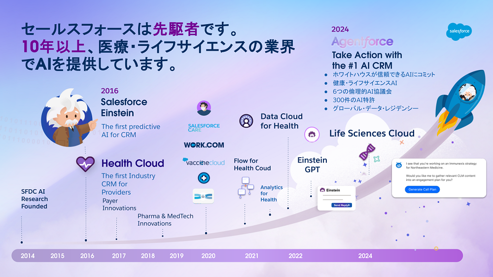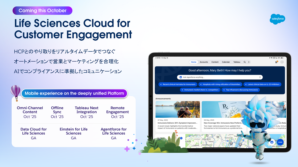 株式会社セールスフォース・ジャパンは、今年10月から製薬や医療機器などライフサイエンス企業向けのエンゲージメントプラットフォーム「Life Sciences Cloud for Customer Engagement」の提供を開始する。最大の特徴はAIエージェントの存在だ。医師へのメールの作成はもちろん、医師に対する効果的かつ効率的なコミュニケーション戦略も提案してくれるなど、MR業務効率の大幅な向上が期待できる。