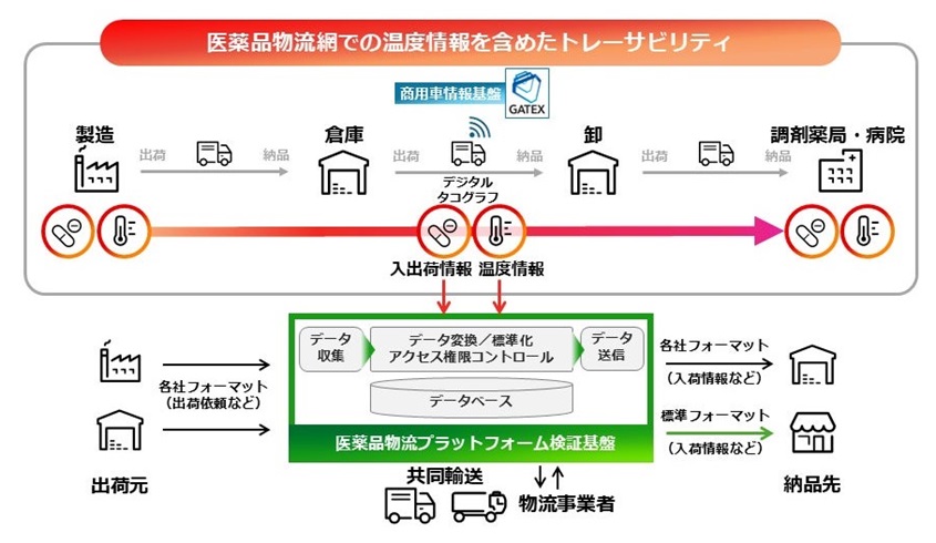 今回実証する医薬品物流プラットフォームは、メーカー工場から調剤薬局・病院までの物流網にある医療用医薬品を一気通貫で“見える化”することが特徴のひとつとなる。入出荷情報や在庫情報、輸送時を含む温度情報、トラックの位置情報などの各種データをデジタル技術を用いて共有・一元管理して実現する。共同輸送にも対応できるようにする。