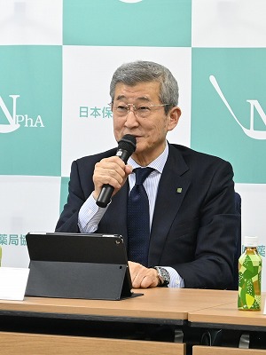 「ルールは、環境や社会の状況に応じて変わっていくと思うが、一回決まったにもかかわらず、過去に遡って全部変更するとなると、もう経営計画が立てられない」と話した。この例として、敷地内薬局をあげ、「合法の中で許されていた行為が突然、“けしからん”と変わった」との見方を表明。24年度調剤報酬改定で特別調剤基本料Aが新設され5点に引下げられたほか、技術料が90%減、薬剤料が10%減となったことに触れ、「こういうことを行政が先頭に立ってやるということはあり得ないことだ。同じことは二度と起こさせないというところを中心的に活動してきた」と話した。「こんなことが起きたのは薬局業界だけではないのか。前回(24年度改定)、そういうことを許してしまったのは忸怩たる想いだ」と吐露した。