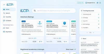 iDCPは、グローバルでスタートアップ・アカデミアとVCなど投資家とのパートナーシップを促進するマッチングプラットフォーム。“アジアの技術と情報を解き放つ”をコンセプトに、アジアのスタートアップ・アカデミアの有する情報を可視化。AIがVC・製薬企業の興味領域とスタートアップ・アカデミアの技術情報を自動マッチングする。