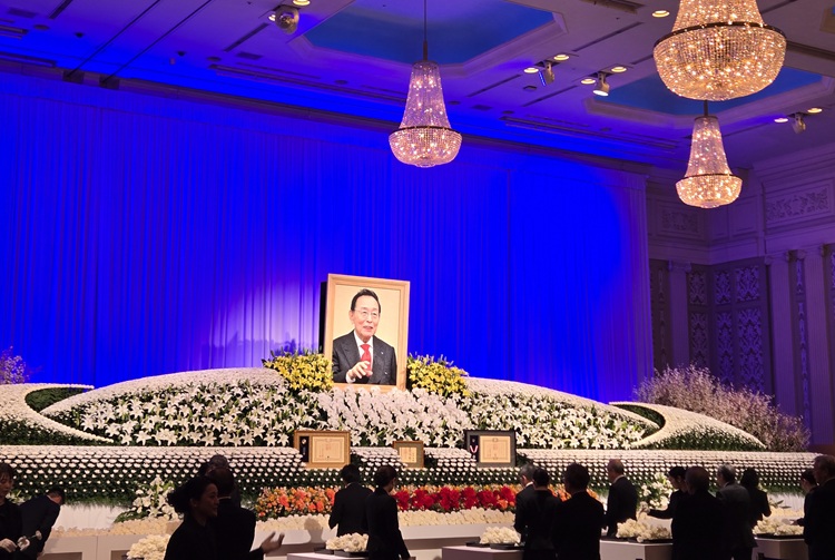 会場内には、故人が愛用した品々や家族への手紙、これまでの歩みを振り返る写真パネルなどが展示され、多くの参列者が足を止めて思い出を語り合っていた。幅約18メートルにおよぶ祭壇には、藍綬褒章(08年5月)、旭日中綬章(13年5月)、正六位(25年12月)が飾られた。参列者は献花を行い、長年にわたり業界の発展に尽力した故人の遺徳を偲んだ。