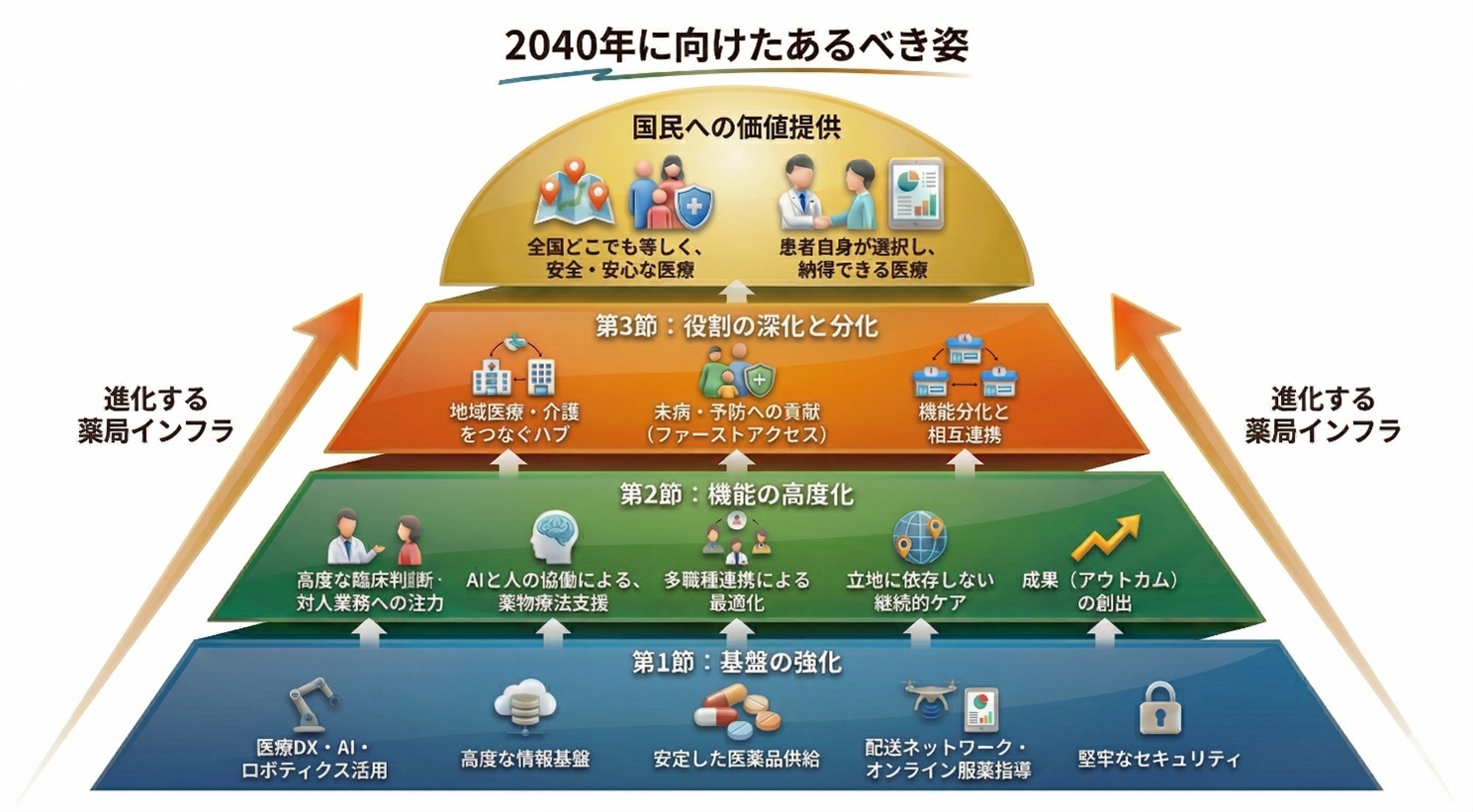 2040年に向けたあるべき姿については、「基盤の強化」「機能の強化」「役割の深化と分化」の3つの観点でまとめた。基盤の強化では、医薬品の安定供給を前提とした上で、医療DX・AI・ロボティクスの活用や情報基盤の強化、セキュリティの担保を通じた「社会的インフラとしての強靭な基盤の確立」を目指すとした。